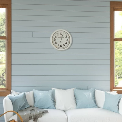 Add character to your living space with this European style wall clock. The frame is a distressed white finish with grooves going around the frame. The dial is a similar distressed white color with the words Station Kensington under the twelve and London 1879 right above the six. At almost 2 ft. in dia this makes a great clock for a larger room/wall with an easy to read dial.