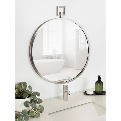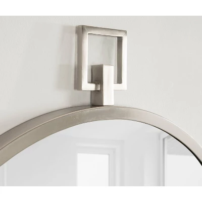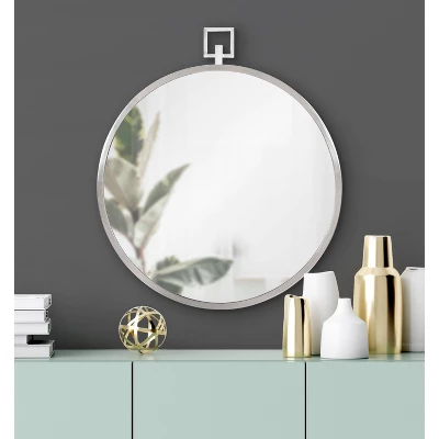 The Tabb mirror brings glamorous sophistication to your wall with its bold and elegant design! Putting a modern twist on vintage glamour, the Tabb mirror features a trendy, round shape, with an ornamental, square crown at the top. This design gives it a pendant-inspired look, delivering a unique accent piece that looks great on any wall. The frame and top ornament are made from a robust iron material with an elegant silver finish, giving it an elegant appeal that is meant to stand out in all the right ways. The overall dimensions of this round mirror are 24 inches wide by 1 inch deep by 28 inches tall, making it an outstanding focal point in your decorative space. Adding a feature like the Tabb wall mirror enhances your space by drawing in more light, allowing it to feel more open and spacious. This mirror looks fabulous whether you decide to hang it over a mantle, above a console, or over your vanity as a dazzling bathroom mirror. Regardless of where you hang it, the installation process takes a matter of minutes with metal keyhole hangers attached to the back.