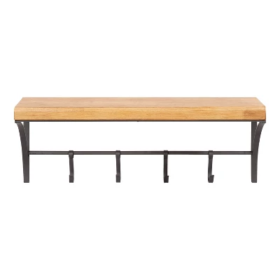 This modern storage shelf is the perfect way to showcase your style with a functional element. Putting a modern twist on farmhouse functionality, the Ozias shelf features a sleek, minimal design with a solid wood shelf and four functional iron hooks. The two-tone rustic brown and black finish brings a comforting coziness to your space while blending into a variety of decorative themes in your home. This modern farmhouse shelf’s overall dimensions are 24 inches wide by 7 inches deep by 9 inches tall, making it a fantastic storage element to keep by your entryway, in your bathroom, in the bedroom, or in your kitchen. The hooks each have a 3 lb. weight capacity, so they’re perfect for your light jackets, aprons, robes, pet leashes and more! The 7-inch shelf depth is robust and ready for 10 lbs. of items, making it a fabulous surface for showcasing your favorite family photos, prized keepsakes, or holding household items. Hang this beautiful shelf in only a matter of minutes with the metal eyelet hangers attached to the back of the frame.