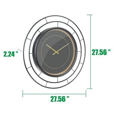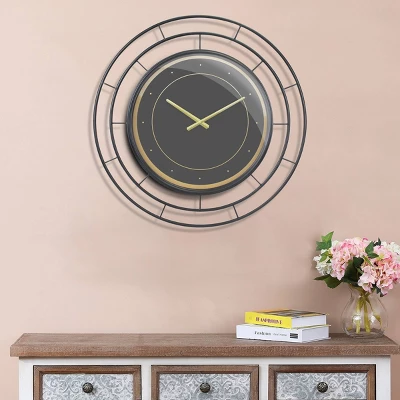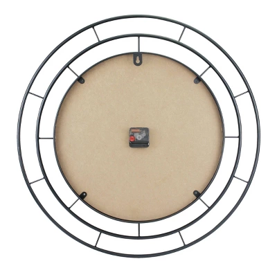 Add a touch of modern flare to your home decor with a Stonebriar 27.5″ decorative round wire metal wall clock. This clock features a black radial wire metal frame with gold trim for a clean modern feel. Clock comes with attached keyhole hanger and is easily installed with a screw or wall hook (not included). Clock measures 27.5 inches in diameter and is the perfect size for over the mantel or as an accent for your kitchen, bedroom, office, or living room. Decorative clock is battery operated and requires a single AA battery (not included).