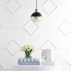 - Off-white fabric drum shade with gosgrain ribbon trim.