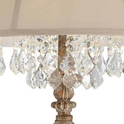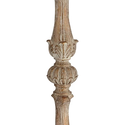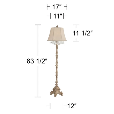 With intricate details throughout the base and lamp body, this candlestick floor lamp features a distressed finish for a vintage look. Topped with a cream colored bell shade with crystal glass beading. From the Duval French Crystal lighting collection.