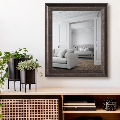 A richly dark bronze frame borders this charming mirror presented by Yosemite Home Décor. This design is both neutral and pleasant. It will compliment your home fabulously with its ability to pair well with various decor styles. The beveled glass allows for more light, making rooms appear larger and brighter. Bring it home to use and enjoy with your friends and family.