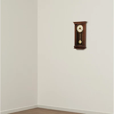 - WALL CLOCK: This Sinclair Wall Clock features a Cherry Bordeaux finish on select hardwoods and veneers to complement your home decor. It has an inverted V-matched teak wood veneer on the front, fluted columns, and gold detail on the glass.