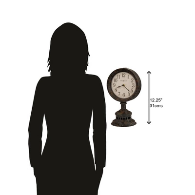 - Antique Style: This metal clock has an antique black finish. It’s enhanced with rust and gray tones for an aged appearance, and it has cut-out details around the base for visual interest. This timepiece is a stylish focal piece for the mantel.
