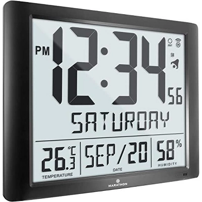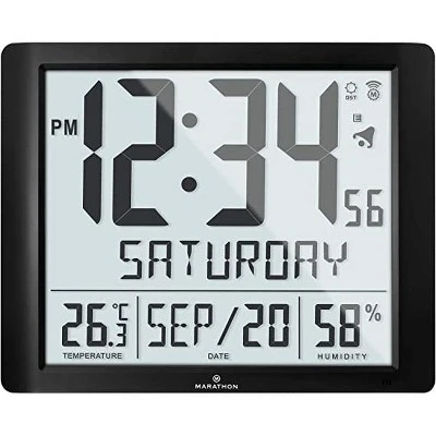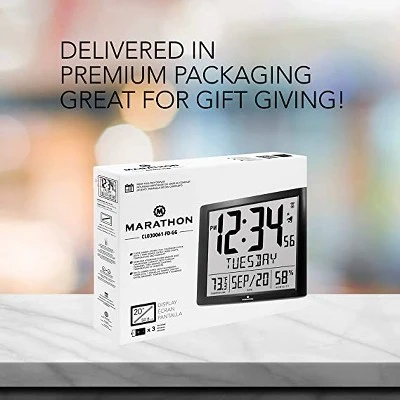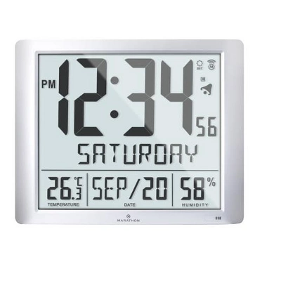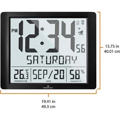 Marathon’s Super-Jumbo Atomic Wall Clock is one of our largest models. Measuring 19 x 15.5 inches with 6.5-Inch-tall numbers makes this clock extremely easy to read, even at a distance. The atomic feature ensures that the time, day and date are always accurate. It adjusts automatically for daylight savings (this option can be turned on or off). Full Calendar Weekday can be displayed in one of the 3 languages (English, French, & Spanish). This Clock also has Indoor temperature and humidity. It can be wall mounted or displayed on a desktop with its built-in foldable stand, making it ideal for home, office and workstation settings. It features a sleek, modern design that looks great with all styles of decor. Experience a genuine Marathon clock.