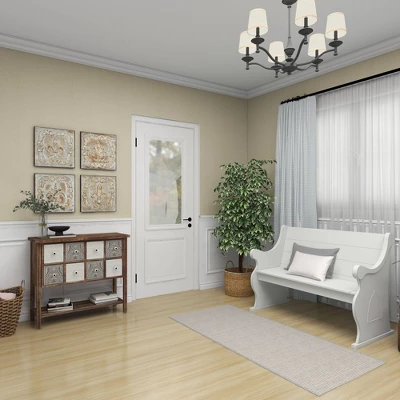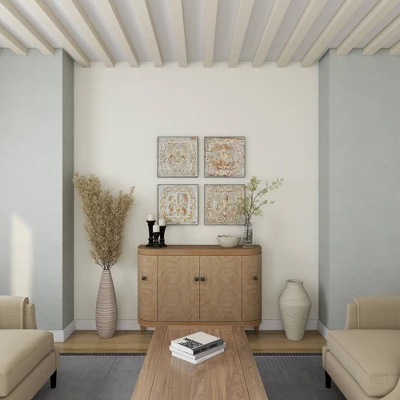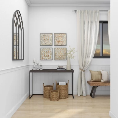 Maximize your wall space to create depth and balance with this uniquely designed wall Decor. This item ships in 1 carton. Can be hung vertically using the metal rings on the back; nails and screws not included. Suitable for indoor use only. This item ships fully assembled in one piece. This brass colored wall sculptures comes as a set of 4. Rustic style.