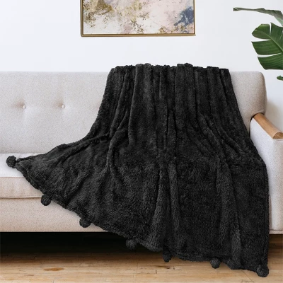 Faux Shearling Throw Blanket with Pom Pom Fringe for Couch, Sofa by PAVILIA