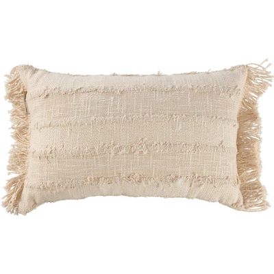 A decorative cream cotton pillow from our Bohemian Collection displaying striped patterns using a fringe technique for a freeform style. The pillow features a zipper to easily remove and clean the cover. Our Neutral Fringe pillow contains polyester filling and is shipped vacuum-sealed for protection and storage. A neutral everyday home accent that coordinates with a variety of décor.