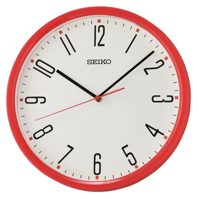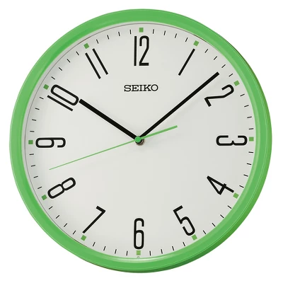 “The Seiko 12″” Kihon wall clock is a delightful and modern timepiece that adds a playful pop of color to any space. Boasting a round shape, this clock features charming numerals in a range of bright and cheerful hues. You can personalize the look to suit your style by choosing from three frame color options: blue, green, or red. With its fun-loving and contemporary design, the Seiko Kihon clock is a perfect addition to any home or office that needs a touch of vibrant energy.
