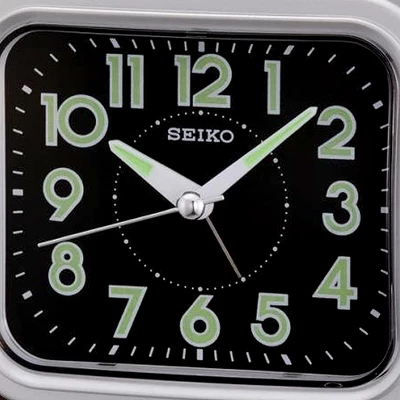 Stay on schedule with the Nori Alarm Clock. It features a silver case with a plastic cover. The bell/beep alarm comes complete with a snooze function, volume control, light and the quiet-sweep second hand eliminates ticking. The Arabic numbers and hands are luminous (get up and glow feature), and will stay visible for a short time after the lights are turned out.