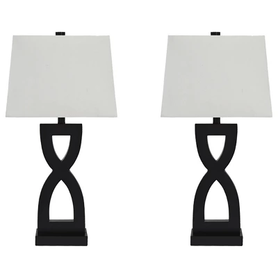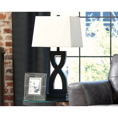 Make a bold and beautiful statement with this table lamp. Structured hardback shade and sculptural base are the perfect pairing for a clean-lined, ultra-contemporary look. Matte black finished table lamp. Empire rectangle hardback shade. 3-way switch. (1) E26 socket, type A bulb recommended – 150 watts max or 25 watts max CFL. Signature Design by Ashley is a registered trademark of Ashley Furniture Industries, Inc.