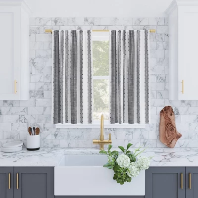 Infuse southwestern chic into any room of your home with the Slub Texture Stripe Cotton Cafe Curtain Pair from Archaeo. Featuring yarn-dyed vertical stripes, this slub textured semi-sheer cotton fabric gently filters light while enhancing privacy. Ideal for kitchens, bathrooms, or small windows, the pole top rod pocket design allows for simple slide-through installation on curtain rods up to 1.5” in diameter. Sold as a set of two tiers. Coordinating valances or swag pairs are sold separately. Measure carefully before selecting your desired size. Rod not included. Hand wash using cold water. Use non-chlorine bleach when needed.