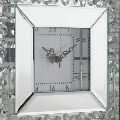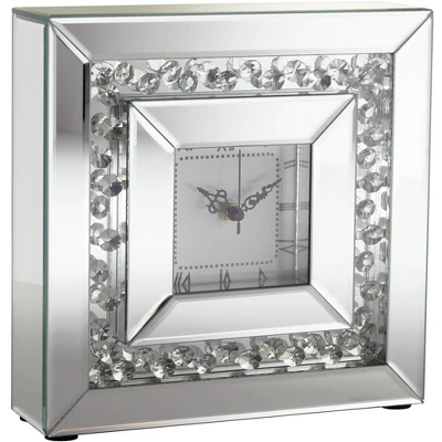 Mark time in a glam-rich design, choosing this decadent table clock as a central focus in a custom living space. This clock by Studio 55D offers a mirror surface with charming crystal accents. Framed effects add dimensional elegance to this clock, which looks exceptional as a desk accessory or on a mantel. Black Roman numerals and black finish dials preserve a romantic traditional feel.