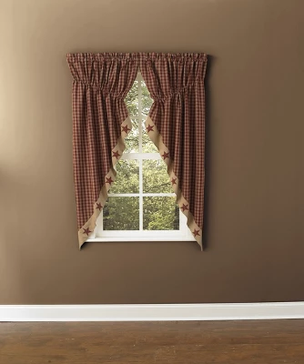 Adds rustic character to your farmhouse window decor from the wine red and beige plaid pattern. The primitive swag curtain is beautifully accentuated by star patches and a gathered effect for a timeless country charm in any room of the house. The lining of the gathered swag window treatment provides an additional layer that helps to control the amount of light entering the room, while also contributing to improved insulation and energy efficiency.