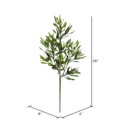 Vickerman 26″ Artificial Green Olive Leaf Spray. This Olive Leaf Spray is made of Polyester and Features 18 Branches with a lush green foliage, Olives. Includes 3 pieces per pack.